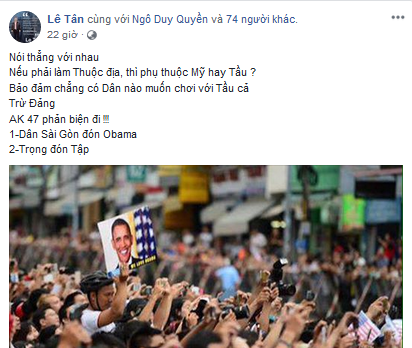 Thứ nhất, họ tuyên bố rằng họ sẵn sàng “làm thuộc địa” của Mỹ. Chẳng hạn, ông Lê Tân, đảng viên Việt Tân ở nước ngoài, đã viết trên Facebook cá nhân như sau: