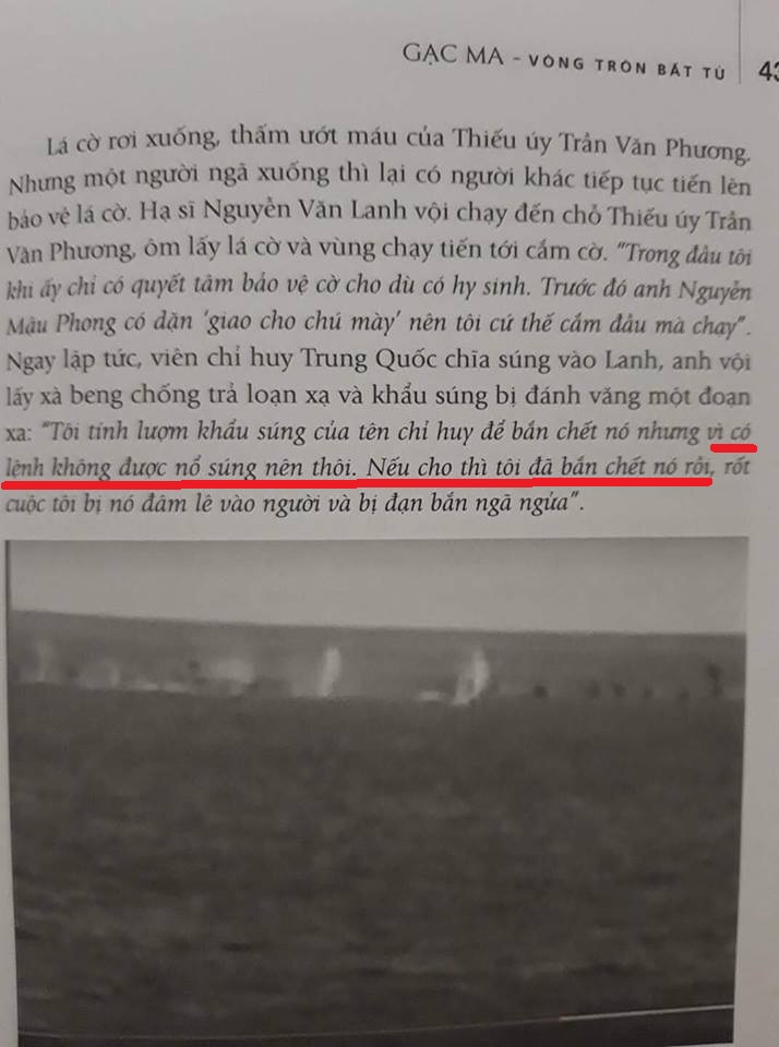 Đây là một thông tin sai sự thật, sai về đường lối quan điểm và vô cùng nguy hại. Lúc đó, tôi là đảo trưởng, là người chỉ huy chiến đấu trực tiếp trên đảo mà có nhân được lệnh của ai không cho phép nổ sung đâu! Tuy chưa đọc hết cuốn sách nhưng tôi thấy lời lẽ trong quyển sách có quan điểm nó không đúng. Ví dụ: Các anh ấy viết Hải quân Việt Nam và Trung Quốc đang tranh chấp ngoài đảo là sai. Bởi, quần đảo Hoàng sa, Trường Sa là của Việt Nam. Trung Quốc đến xâm lược thì tại sao lại gọi là tranh chấp được.