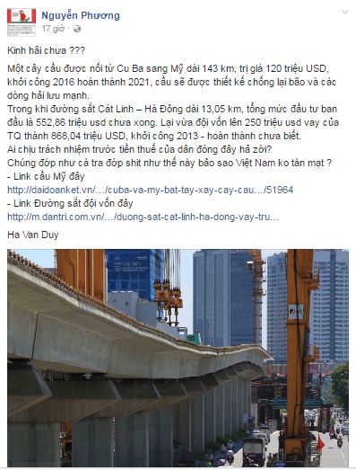Đương nhiên, stt này thu hút được đông đảo bạn đọc nhày vào chửi chính quyền tham nhũng. Đa số bình luận theo hướng “giá thành xây cầu ở Mỹ rất thấp, giá thành xây cầu, đường ở Việt Nam quá cao, cao hơn hàng chục lần, tham nhũng thật khủng khiếp, nợ công cao, đất nước nghèo là ở đây”.