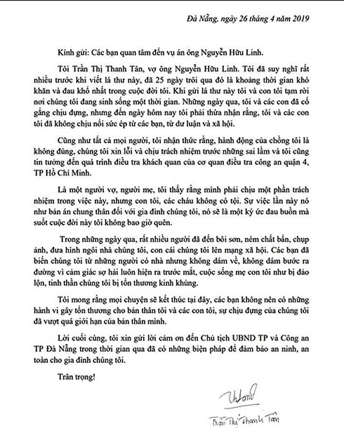 Bà Trần Thị Thanh Tân, vợ bị can Nguyễn Hữu Linh viết: “Tôi thấy rằng mình phải chịu một phần trách nhiệm trong việc này, nhưng con tôi, các cháu không có tội. Sự việc lần này như bản án chung thân đối với gia đình chúng tôi”.