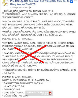 Fanpage “Phe Đối Lập Bật Đèn Xanh Chờ Tổng Biểu Tình Đổi Tên Đảng Xóa Nợ Thoát TC” đã thông tin cụ thể ngày giờ kèm các địa điểm tập kết như sau “Ngày 8/10 tháng 6/2019 – địa điểm tại: Sân bay Tân Sơn Nhất 8 giờ A.M; Nhà thờ Đức Bà; Dinh Độc Lập; Chợ Bến Thành; Công viên Tao Đàn…”.