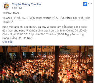 Hôm nay ngày 30/6/2019 Truyền Thông Thái Hà lại tiếp tục hô hào, kích động giáo dân phá hoại việc triển khai thực hiện các kế hoạch phát triển kinh tế xã hội của Thủ đô thông qua cái gọi là “Thánh lễ cầu nguyện cho Công lý & Hòa bình tại nhà thờ Thái Hà” tại 180/2 Nguyễn Lương Bằng, Đống Đa, Hà Nội.