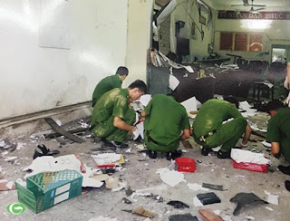 Cơ quan Công an tiến hành khám nghiệm hiện trường vụ nổ tại trụ sở phường 12, quận Tân Bình.