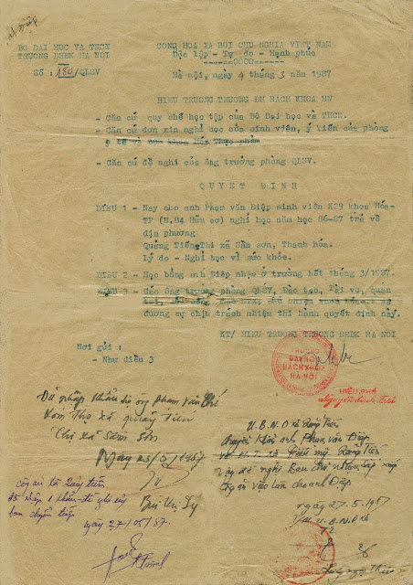 Quyết định của Hiệu trưởng Trường Đại học Bách khoa cho Điệp thôi học “trả về địa phương” tháng 3/1987