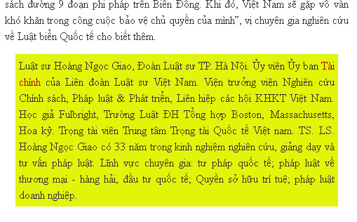 “Luật sư Hoàng Ngọc Giao, Đoàn Luật sư TP. Hà Nội. Ủy viên Ủy ban Tài chính của Liên đoàn Luật sư Việt Nam. Viện trưởng viện Nghiên cứu Chính sách, Pháp luật & Phát triển, Liên hiệp các hội KHKT Việt Nam. Học giả Fulbright, Trường Luật ĐH Tổng hợp Boston, Massachusetts, Hoa kỳ. Trọng tài viên Trung tâm Trọng tài Quốc tế Việt nam. TS. LS. Hoàng Ngọc Giao có 33 năm trong kinh nghiệm nghiên cứu, giảng dạy và tư vấn pháp luật. Lĩnh vực chuyên gia: tư pháp quốc tế; pháp luật về thương mại – hàng hải, đầu tư quốc tế; Quyền sở hữu trí tuệ; pháp luật doanh nghiệp.”