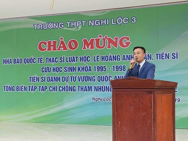 Số là ông Lê Hoàng Anh Tuấn xuất hiện trong Lễ “vinh quy bái tổ” tại Trường THPT Nghi Lộc III, huyện Nghi Lộc, tỉnh Nghệ An. Trường này long trọng tổ chức lễ Chào mừng Nhà báo Quốc tế, Thạc sĩ Luật học, Tiến sĩ, Lê Hoàng Anh Tuấn, cựu học sinh khóa 1995 – 1998, Tiến sĩ Triết học danh dự từ Vương Quốc Anh 2018, Tổng Biên tập Tạp chí Chống tham nhũng và Hợp tác Quốc tế, Viện trưởng Viện Pháp luật kinh doanh và đầu tư Châu Âu.