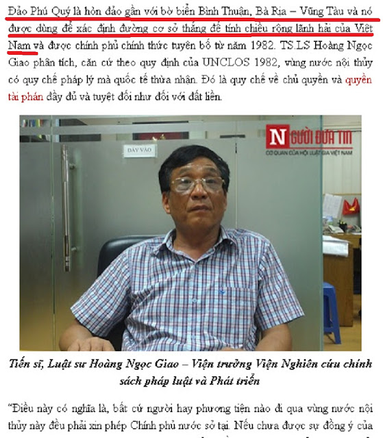 Nếu theo lời ông nói như trên thì vùng nội thủy VN đã bị … thu hẹp chừng 70 km so với Tuyên bố năm 1982 của Chính phủ. Bởi Đảo Phú Quý không hề nằm trên đường cơ sở VN mà Đảo Phú Quý nằm trọn trong vùng nội thủy.
