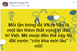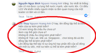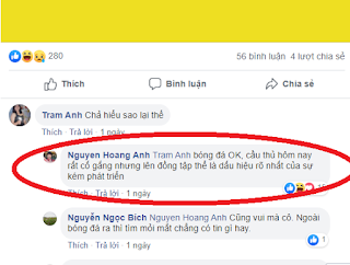 Vào bình luận Stt của cô Nguyễn Hoàng Ánh, Fbker Tram Anh hỏi: “Chả hiểu sao lại thế?” thì cô giáo trả lời: “bóng đá OK, cầu thủ hôm nay rất cố gắng nhưng lên đồng tập thể là dấu hiệu rõ nhất của sự kém phát triển”.