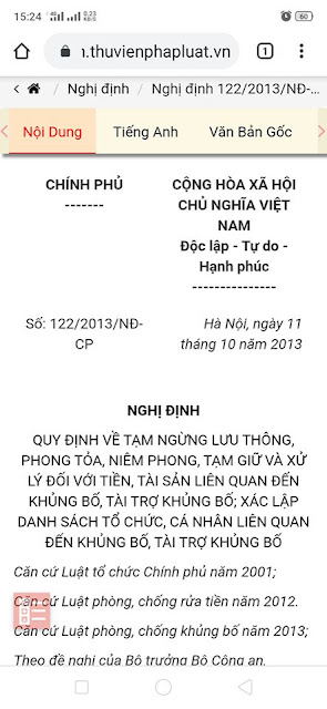 Sau khi vụ Đồng Tâm toang, lấy danh nghĩa là tiền phúng điếu, các anh chị tiếp tục tài trợ. Trong các nguồn tài trợ, thì có cả nhân đạo, và có cả núp bóng nhân đạo. Nhưng như kẻ già này đã nói, anh Kình & Co. là khủng bố. Nên các nguồn tài trợ này đều xem như là tài trợ cho khủng bố. Thế là nó nằm trong phạm vi, đối tượng của Nghị định 122/2013 của Chính phủ rồi. Về việc này, lẽ ra anh Luân Lê phải bị 2 điểm, về chỗ, nhưng châm chước, nên lão đề nghị cho anh về nhà học lại bài.