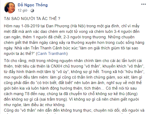 Cách đây vài tháng, hôm 1/9/2019, một vụ thảm sát kinh hoàng xảy ra ở Đan Phượng, Hà Nội, khiến 4 người tử vong. Nguyên nhân được xác định là do tranh chấp đất đai giữa 2 anh em. Hung thủ đã bị bắt và sẽ phải trả giá cho những hành vi mất nhân tính của hắn. Trong khi chúng ta vẫn còn không hết bàng hoàng vì sự man rợ của tên giết người thì cũng chính ông PGS Ngữ văn Đỗ Ngọc Thống đã nhân danh khoa học, lợi dụng vụ việc để tấn công chế độ từ nền tảng tư tưởng đến lãnh đạo đất nước…