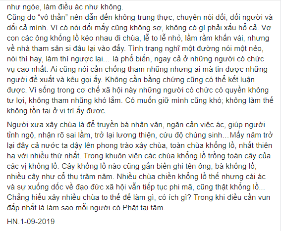 “Cũng do “vô thần” nên dẫn đến không trung thực, chuyên nói dối, dối người và dối cả mình. Vì có nói dối mấy cũng không sợ, không có gì phải xấu hổ cả. Vợ con các ông khổng lồ kéo nhau đi chùa, lễ to lễ nhỏ, lầm rầm khấn vái, nhưng về nhà tham sân si đâu lại vào đấy. Tình trạng nghĩ một đường nói một nẻo, nói thì hay, làm thì ngược lại… là phổ biến, ngay cả ở những người có chức vụ cao nhất. Ai cũng nói cần chống tham nhũng nhưng ai mà tin được những người đề xuất và kêu gọi ấy. Không cần bằng chứng cũng có thể kết luận được. Vì sống trong cơ chế xã hội này những người có chức có quyền không tư lợi, không tham nhũng khó lắm. Có muốn giữ mình cũng khó; không làm thế không tồn tại ở vị trí ấy được.”.