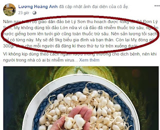 Dòng status của chị nghe đơn thuần là nhận xét hoặc thông báo có tính cá nhân, nhưng lại là cú đánh cực mạnh vào kinh tế của người dân Lý Sơn, là đón giáng chí mạng vào thương hiệu Việt: Tỏi Cô đơn Lý Sơn.