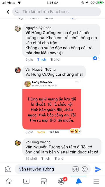 Thậm chí, khi bị người đọc phản đối, chị lại công nhiên khoe rằng chị thuộc gia đình danh giá, có chú làm tình báo quân đội, chú làm tình báo công an và đe dọa sẽ tìm ra người vào phản đối hoặc viết bài bóc phốt chị. Tởm chưa?!