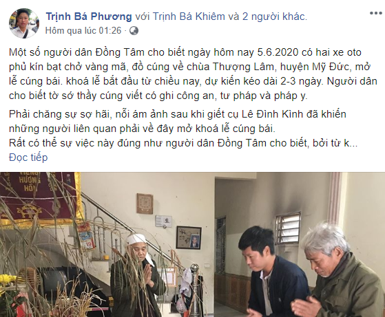 Té nước theo mưa, Mạc Văn Trang mới có stt “Thời mạt!” trên Facebook. Stt của Trang già có nội dung y hệt Trịnh Bá Phương, cũng viết rằng: “Một số người dân Đồng Tâm cho biết ngày 5.6.2020 có hai xe ô tô phủ kín bạt chở vàng mã, đồ cúng về chùa Thượng Lâm, huyện Mỹ Đức, mở lễ cúng bái. Khóa lễ bắt đầu từ chiều nay, dự kiến kéo dài 2-3 ngày. Người dân cho biết tờ sớ thầy cúng viết có ghi công an, tư pháp và pháp y. Phải chăng sự sợ hãi, nỗi ám ảnh sau khi giết cụ Lê Đình Kình đã khiến những người liên quan phải về đây mở khoá lễ cúng bái”.