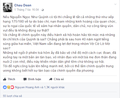 Trong một stt mới đây, như thường lệ, vẫn kiểu đá xéo chế độ, anh Đoàn Bảo Châu viết:
