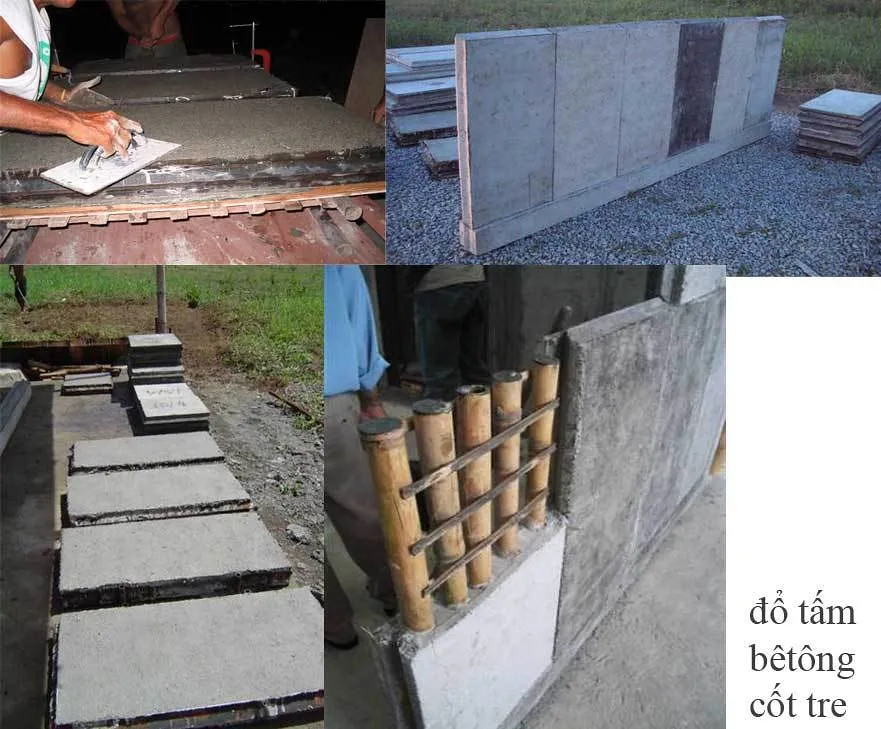 Tấm đan cốt tre, đang được sửa soạn, nối tre, bắn đinh trong khung sắt với cạnh có mối nối. Khung được bôi dầu khi đổ để dỡ khuôn không bị dính. Đổ trên sàn, không cần khuôn cho mặt trên và mặt dưới. Khi phơi bêtông phải tưới nước hay che nắng cho khỏi bị nứt trên mặt. Tre cũng phải đặt sâu bên trong, cho vết nứt không làm thấm nước mưa vào làm mục tre sau này.