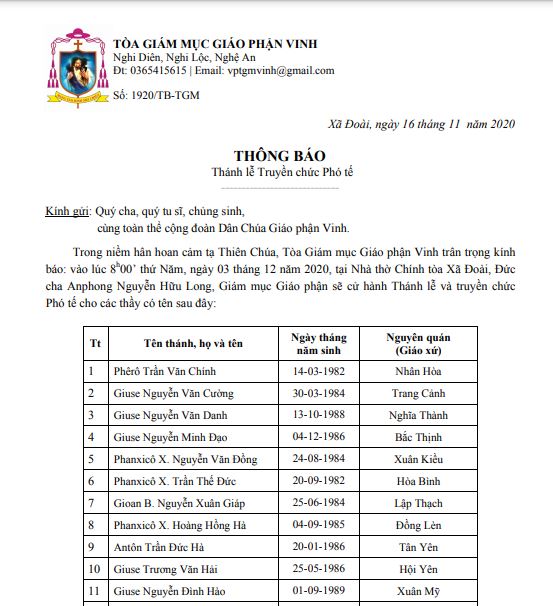 Vào hôm 5/11/2020, Tòa Giám mục Giáo phận Hà Tĩnh có Thư rao số 32/2020/T-GM thông báo về việc Truyền chức Linh mục cho 14 thầy Phó tế thuộc Khóa XIII, Đại Chủng viện Thánh Phanxicô Xaviê. Xem ảnh dưới: