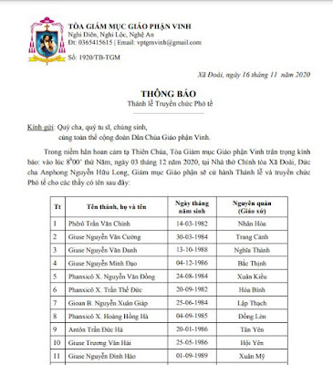 Trong một diễn biến tương tự, đến ngày 16/11/2020, Tòa Giám mục Giáo phận Vinh cũng có văn bản thông báo về việc Truyền chức cho các thầy thuộc Khóa XIII, Đại Chủng viện Thánh Phanxicô Xaviê.