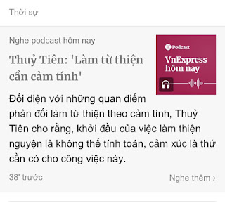 Sớm nay, một tờ báo mạng đã có bài phỏng vấn với ca sỹ Thủy Tiên xung quanh việc làm từ thiện bão lũ tại miền trung trong thời gian vừa qua. Một điều có hơi đặc biệt là bài phỏng vấn này được thực hiện dưới dạng audio và đăng vào khoảng thời gian rất sớm, khi mà gà còn chưa gáy sáng. Phải chăng là muốn né một đối tượng độc giả nào đó, những người ít nghe phát thanh và thường ngủ nướng vào mỗi buổi sáng chủ nhật !?