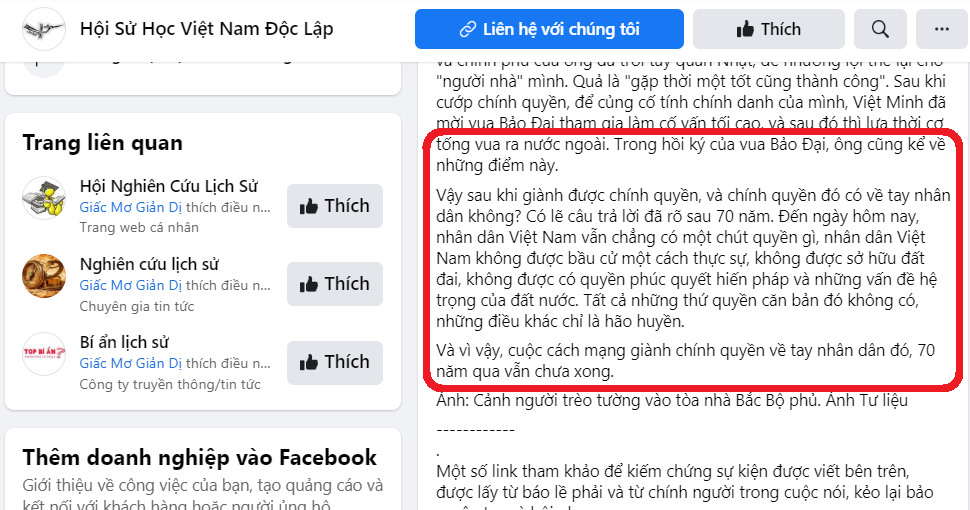 Tình cờ vào trang mạng Facebook có tên “Hội sử học Việt Nam độc lập” tôi giật mình vì gần như 100% các bài viết trên trang này đều có nội dung cực kỳ phản động. Nó hoàn toàn không phải là trang nghiên cứu về lịch sử mà là công cụ chống phá chế độ bằng cách xuyên tạc lịch sử hoặc núp bóng lịch sử.