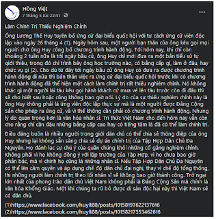 Cuối cùng, xin nhắc lại câu của một bạn đọc viết về chuyện Lương Thế Huy ứng cử ĐBQH và HĐND các cấp: “Weaponzing LGBT Rights in the case of Luong The Huy. Case study of Western imperalists seeding color revolution in VN“, tạm dịch là “Vũ khí hóa Quyền LGBT trong trường hợp Lương Thế Huy: Nghiên cứu trường hợp chủ nghĩa đế quốc phương Tây gieo mầm cách mạng màu ở Việt Nam”.