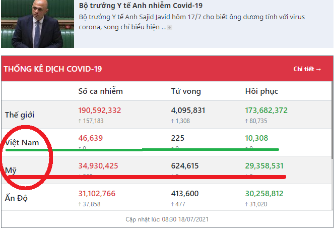 Hãy nhìn vào con số thống kê cho tới lúc 8h30 ngày 18/7/2021 với đường gạch màu xanh là thống kê cho Việt Nam, màu đỏ là cho Mỹ để thấy bản chất vấn đề. Mời xem hình chụp màn hình từ VietnamNet ngay dưới đây: