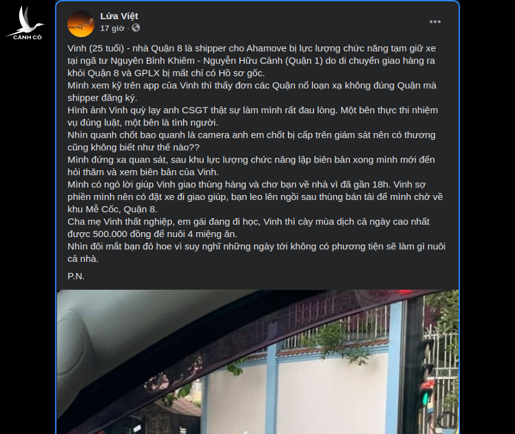 Chiều ngày 8/8, mạng xã hội chia sẻ hình ảnh shipper tên Vinh bị cảnh sát giao thông vì xử phạt, tạm giữ phương tiện do vi phạm quy định về vận chuyển hàng hóa. Câu chuyện khiến nhiều người không khỏi thương cảm hoàn cảnh của Vinh, nhưng lợi dụng sự việc này, đối tượng Phạm Minh Vũ, cũng như mọi lần, lại lợi dụng 2 chữ “Nhân Dân” để bóp méo sự thật, thóa mạ đất nước và con người Việt Nam…