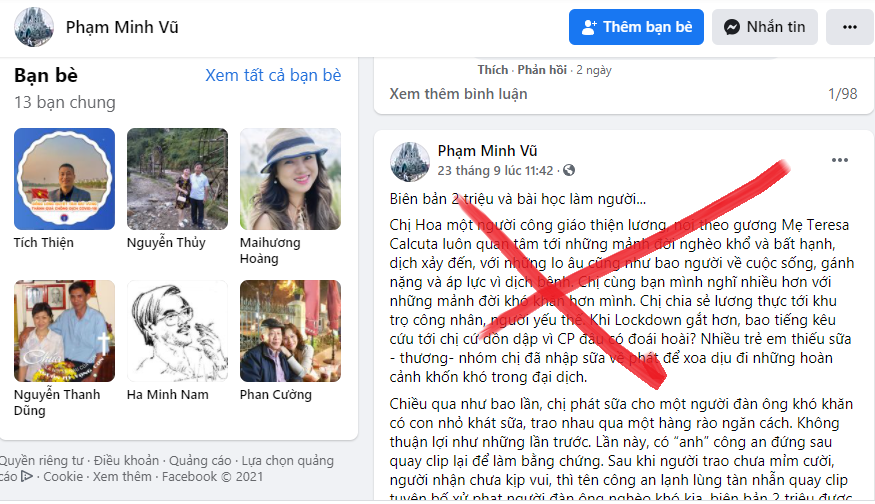 Hôm 27/7, lợi dụng tình hình đại dịch Covid-19 diễn biến phức tạp, dưới vỏ bọc “thưởng cảm”, Phạm Minh Vũ viết bài “Nhìn đâu cũng thấy những quằn quại” để lừa đảo chiếm đoạt lòng tin của người dân” bằng các bịa đặt, kiểu như “Người dân tranh giành hàng tiếp tế do các tổ chức công đoàn, Tôn giáo”, “người dân TP.HCM nghèo khổ, ăn xin, đào bới thùng rác kiếm ve chai sống qua ngày”, “người dân không có lương thực, thức uống”, “Trẻ em xa mẹ gào khóc không có sữa trong khu cách ly”… Tất nhiên, như thường lệ Vũ không đưa ra được bằng chứng nào chứng minh cho điều mình nói. Hình ảnh trẻ em bới thùng rác mà Vũ minh họa, rất tiếc nhanh chóng bị người đọc phát hiện có nguồn gốc tại Philippines.