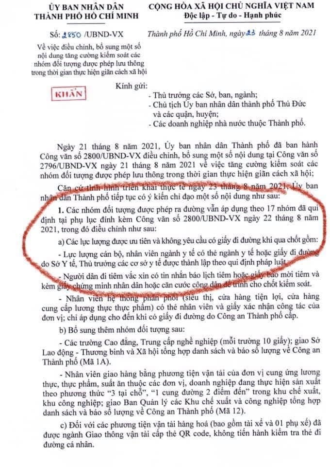 Thật may, sau khi bài đăng được 1 ngày, vào tối nay 4/9, tôi nhận được một số bình luận, trong đó có Fb Đỗ Hạnh cung cấp cho tôi văn bản số 2850 của UBND TP HCM về việc điều chỉnh, bổ sung một số nội dung tăng cường kiểm soát các nhóm đối tượng được phép lưu thông trong thời gian thực hiện giãn cách xã hội, ký ngày 23/8/2021. Theo đó, các nhóm đối tượng được phép ra đường vẫn áp dụng theo 117 nhóm đã quy định tại phụ lục đính kèm công văn số 2800 của UBND ngày 22/8 và bác sĩ thuộc nhóm đối tượng ưu tiên và không yêu cầu phải có giấy đi đường khi qua chốt mà chỉ cần “có thẻ ngành y tế hoặc giấy đi đường do sở y tế, thủ trưởng các cơ sở y tế được thành lập theo quy định của pháp luật.”.