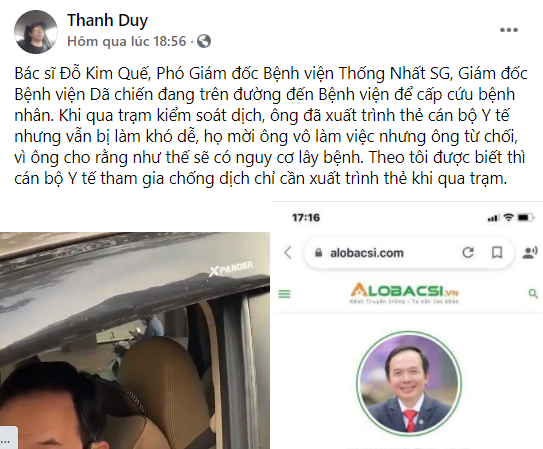 “Bác sĩ Đỗ Kim Quế, Phó Giám đốc Bệnh viện Thống Nhất SG, Giám đốc Bệnh viện Dã chiến đang trên đường đến Bệnh viện để cấp cứu bệnh nhân. Khi qua trạm kiểm soát dịch, ông đã xuất trình thẻ cán bộ Y tế nhưng vẫn bị làm khó dễ, họ mời ông vô làm việc nhưng ông từ chối, vì ông cho rằng như thế sẽ có nguy cơ lây bệnh. Theo tôi được biết thì cán bộ Y tế tham gia chống dịch chỉ cần xuất trình thẻ khi qua trạm”.