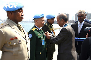 Phó Tổng Thư ký Liên Hợp Quốc Atul Khare đã trao Huy chương Liên Hợp Quốc cho 3 sỹ quan của QĐND Việt Nam đang hoạt động trong Lực lượng Gìn giữ Hòa bình Liên Hợp Quốc.