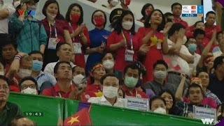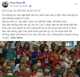 Anh Đoàn Bảo Châu chụp ảnh màn hình buổi tường thuật trực tiếp trận bóng đá nam tranh Huy chương Vàng giữa Việt Nam và Thái Lan tại SEA Games 31 trên VTV6 để lấy hình ảnh “quan chức” đi xem bóng đá, nhưng được ngồi xem ở chỗ cái bàn có biển tên để vờ vịt mạ lỵ ban tổ chức, nhưng thực chất là mạ lỵ lãnh đạo đất nước.