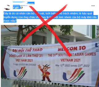 Sáng nay, nhân việc chuẩn bị khai mạc SEA Games 31 tổ chức tại Việt Nam, đám dân chủ tung lên mạng vài tấm ảnh cổ động SEA Games có nội dung: “Đại hội thể thao Đông Lam Á lần thứ 31” rồi lấy cớ băng rôn đó viết sai chính tả, nhầm lẫn Quốc kỳ… để hạ uy tín chính quyền và cơ quan quản lý cũng như các cá nhân có liên quan. Những bức ảnh đó ngay lập tức được lan truyền chóng mặt trên mạng xã hội và các cơ quan quản lý cũng nhanh chóng nhận được gạch đá từ người đọc.