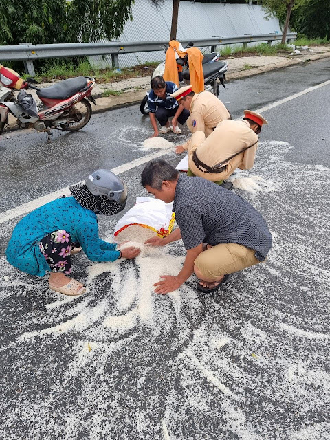 Hình ảnh CSGT cùng người dân giúp người phụ nữ thu dọn số gạo bị đổ trên QL1A qua địa bàn thành phố Phan Rang – Tháp Chàm, tỉnh Ninh Thuận