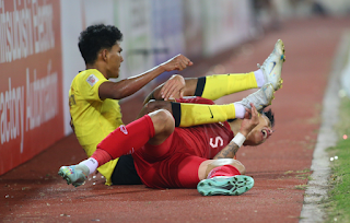 Pha bóng nhạy cảm này diễn ra ở phút 59 khi Văn Hậu quyết tâm đột phá vào vòng cấm địa. Anh đã đẩy ngã hậu vệ số 2 của Malaysia và cả hai văng vào bảng quảng cáo. Có vẻ như ức chế với cú gài bóng của số 5 bên tuyển Việt Nam, Azam Azmi đã đạp vào đầu Văn Hậu.