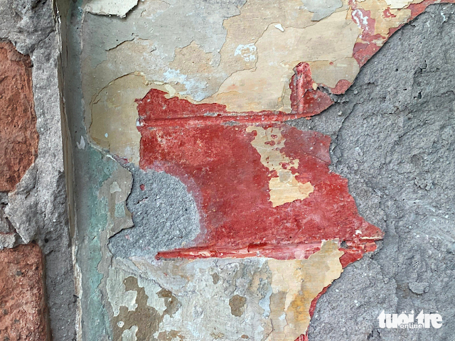 Ảnh chụp lại lớp màu dưới cùng của tường biệt thự có màu vàng và những ô màu đỏ giả gạch – Ảnh: NVCC