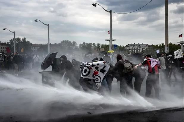 Người biểu tình bị vòi rồng phun ở Lyon. (Ảnh: AFP)