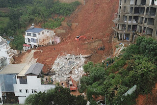 Vụ sạt lở còn làm nhiều nhà cửa, công trình xây dựng bị vùi lấp.