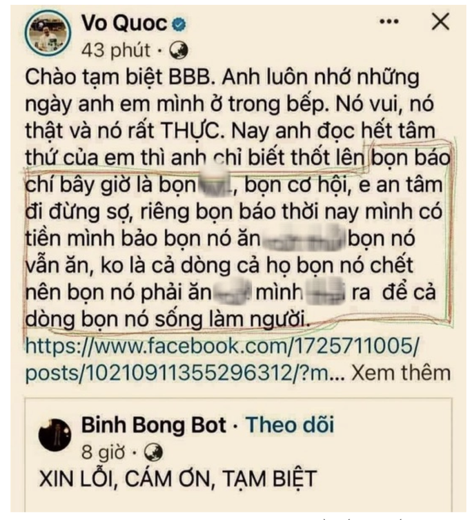 Hai nội dung xúc phạm nặng nề nhà báo, nghề báo trên facebook đầu bếp Võ Quốc