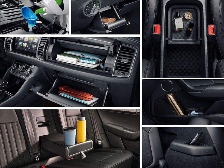 Vấn đề về không gian cất trữ đồ đạc cho những chuyến đi với mục đích khác nhau cũng được tích hợp trên những chiếc xe của Skoda. Đầu tiên phải kể đến hệ thống lưu trữ đồ được bố trí bên trong nội thất xe. Trên bộ đôi xe Kodiaq và Karoq đều có cốp sau với khả năng tùy chỉnh các hàng ghế sau để tăng dung tích cốp.