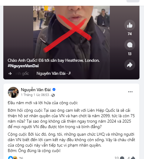 Một trong số những kẻ tích cực tán phát thông tin này có thể kể đến Nguyễn Văn Đài, một đối tượng phản động lưu vong, hiện cư trú ở Đức. Trong vài ngày liền, Nguyễn Văn Đài liên tục đăng tải thông tin xuyên tạc về cam kết nhân quyền của Việt Nam với mốc thời gian là tới năm 2099. Xin trích nguyên văn một status của đối tượng này: