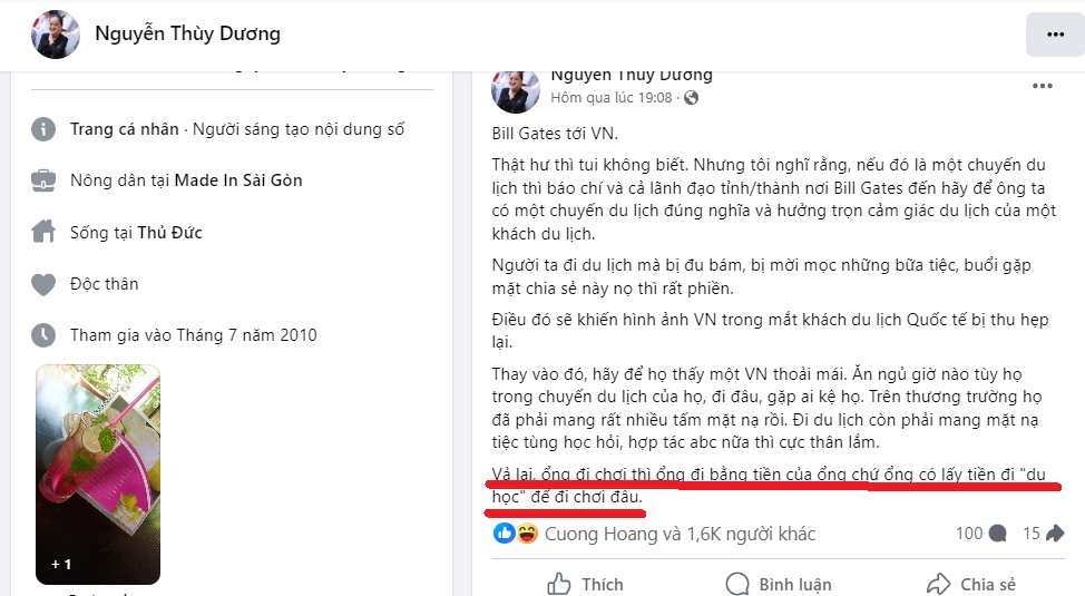 Trên trang cá nhân, một người có nick Nguyễn Thùy Dương đã viết status có tựa: “Bill Gates tới VN”. Nguyên văn như sau:
