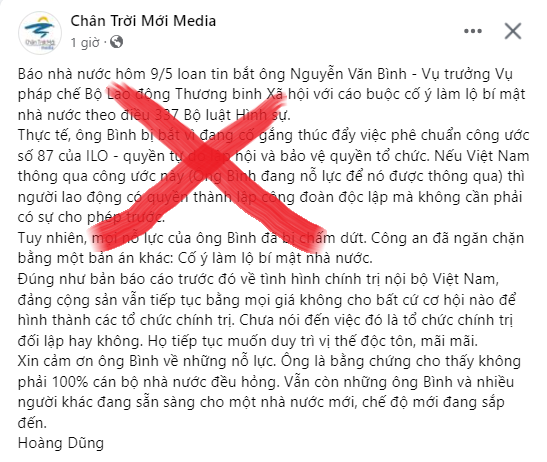 Trong khi cơ quan điều tra công bố lý do ông Nguyễn Văn Bình bị bắt là “cố ý làm lộ bí mật nhà nước” thì bài viết của Hoàng Dũng lại cho rằng, ông này bị bắt “vì nỗ lực thúc đẩy phê chuẩn Công ước số 87 của Tổ chức Lao động Quốc tế (ILO) về quyền tự do lập hội và bảo vệ quyền tổ chức“, nhưng lại không cung cấp được thông tin và bằng chứng để chứng minh cho những cáo buộc của mình. Rõ ràng, Hoàng Dũng đã lợi dụng vụ việc, lợi dụng khoảng thời gian chưa được phép công bố chi tiết vụ việc trong giai đoạn đang điều tra, theo quy định của pháp luật để xuyên tạc, bôi nhọ hình ảnh chính quyền Việt Nam.