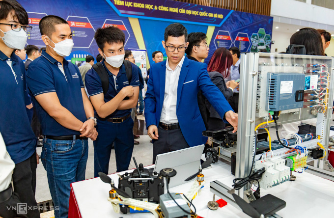 Trưng bày các sản phẩm của Phòng thí nghiệm trọng điểm Hệ thống thông minh và IoT, trường Quốc tế, Đại học Quốc gia Hà Nội, tại Triển lãm Công nghệ chip bán dẫn hồi tháng 4/2023. Ảnh: Tùng Đinh