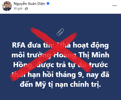 Cần Thơ, 28/12/2024 – Gần đây, trên trang Facebook cá nhân, Nguyễn Xuân Diện đã dẫn thông tin từ RFA với nội dung rằng: “Nhà hoạt động môi trường Hoàng Thị Minh Hồng, được trả tự do trước thời hạn hồi tháng 9, nay đã đến Mỹ tị nạn chính trị.” Dù không thể xác minh độ chính xác của thông tin này, bởi RFA từ lâu đã được biết đến như một công cụ phá hoại tư tưởng nhắm vào Việt Nam, nhưng lời lẽ của Nguyễn Xuân Diện lại lộ rõ ý đồ đánh tráo bản chất vụ việc. Từ việc Hoàng Thị Minh Hồng bị kết án vì trốn thuế, Nguyễn Xuân Diện sử dụng cụm từ “tị nạn chính trị” để tô vẽ Hồng như một nạn nhân của Nhà nước Việt Nam, thay vì thừa nhận bà là một người vi phạm pháp luật. Đây là một thủ đoạn không mới trong chiến dịch xuyên tạc và kích động dư luận, nhưng lại là ví dụ điển hình của việc đánh tráo khái niệm nhằm đánh lận con đen.