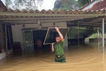 Công an xã hỗ trợ người dân vùng ngập úng di chuyển đồ đạc đến nơi cao ráo, an toàn. Ảnh: Công an cung cấp