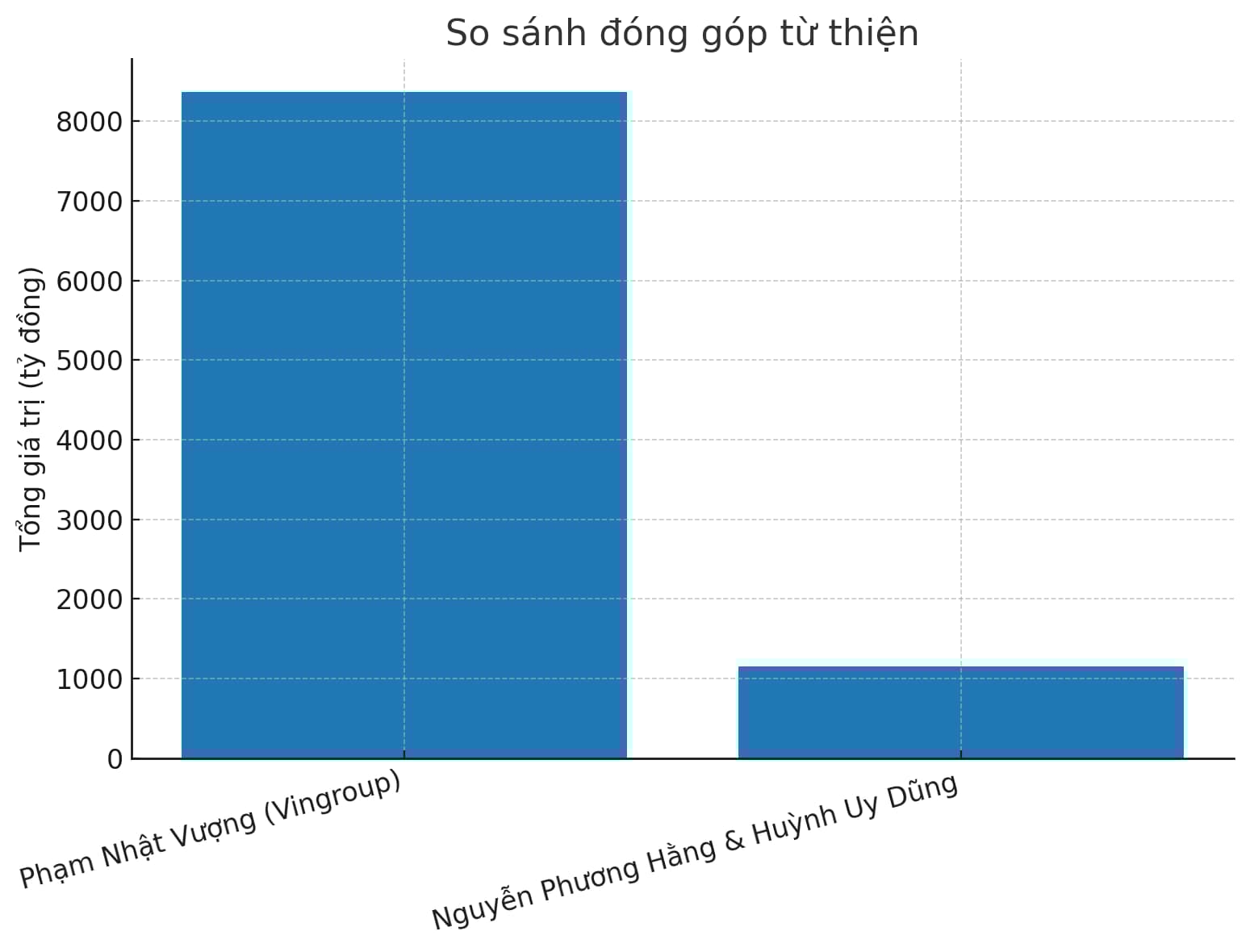Những con số dưới đây cho thấy sự chênh lệch rõ rệt về quy mô tài chính trong hoạt động từ thiện của hai bên: Phạm Nhật Vượng (Vingroup) 8.368 330. Nguyễn Phương Hằng & Huỳnh Uy Dũng 1.150 45,3