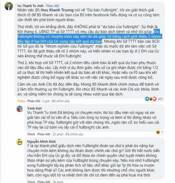 Trưa 23/8, trên trang Facebook cá nhân của mình, Tiến sĩ Vũ Thành Tự Anh đã chính thức lên tiếng xung quanh thông tin liên quan đến nhóm Fullbright dự báo TPHCM dịch đang đạt đỉnh và sẽ kết thúc vào tháng 8. Theo đó về ‘dự báo Fulbright’, ông xin chịu trách nhiệm cá nhân chứ Fulbright không hề liên quan.