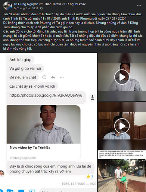 Cụ thể, trong clip “di chúc” (nhờ Nguyễn Trí Dũng đăng) và clip Livestream lúc rạng sáng trước khi bị bắt, Trịnh Bá Phương và Trịnh Bá Tư nói rằng mình không sợ đi tù, kiên quyết đấu tranh chống Cộng.