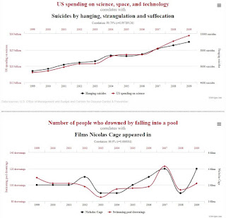 Trang web tylervigen.com là một trang web chuyên đưa ra các đồ thị so sánh kỳ quái nhằm nhấn mạnh việc tương quan không đồng nghĩa với nhân quả như hai ví dụ đính kèm (Hình 2). Ví dụ 1 là mối tương quan giữa số tiền nước Mỹ chi phí cho khoa học, vũ trụ và công nghệ (đo bằng tỷ $) và số lượng người tự tử bằng cách treo cổ, thắt cổ và chết chìm. Tỷ lệ tương quan là 99.79% (gần tuyệt đối). Ví dụ 2 là đồ thị tương quan giữa số lượng người chết đuối trong bể bơi với số lượng phim Nicolas Cage đóng vai trong vòng 10 năm từ 1999 – 2009. Tỷ lệ là 66.66% (một con số có thể coi là trên trung bình).